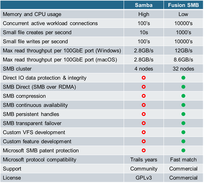 Modern workloads require exceptional reliability through scale-out clustering and persistent handles that can preserve ongoing IO even when a cluster node has died. Fusion SMB’s support of 32 nodes in a scale-out cluster, thousands of load-balanced containers in a hyperscale cloud service, and integration into custom high availability solution from data platforms makes it ideal for enterprises. Samba is limited to 4 node clusters and does not support scale out or persistent handles.