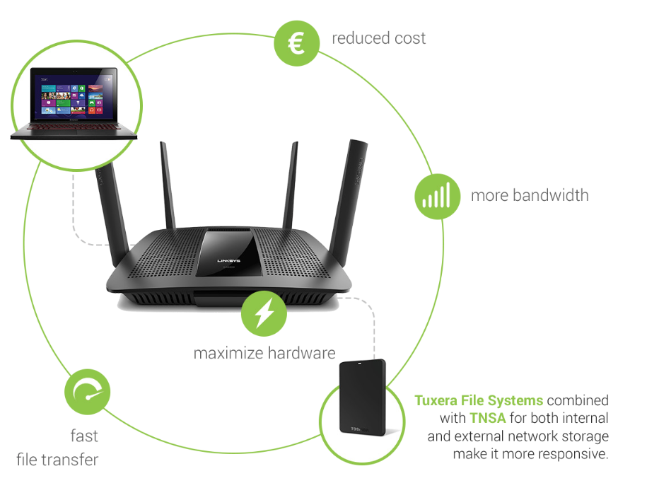 The Tuxera Network Storage Accelerator software (TNSA) helps boost read and write performance on external hard drives connected to select Linksys routers via USB connections at up to 300% improvement.[1] At the same time, Tuxera solutions improve reliability with built-in fail-safe technology, which guarantees volume integrity against corruptions in unexpected plug-off, power-off situations.